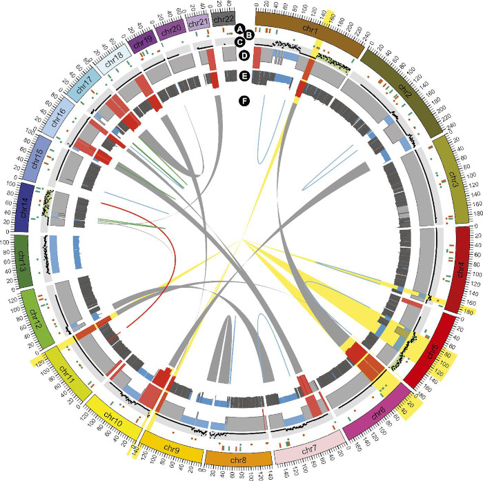 The outer ring represents the chromosomes, the inner ring represents genomic rearrangements. The main axis, x, mapped to the position on the chromosome, and is represented by an angle, generally named theta, on polar coordinates.